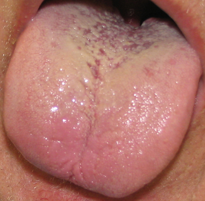 Jazyk je nateklý s lepkavým povlakem.