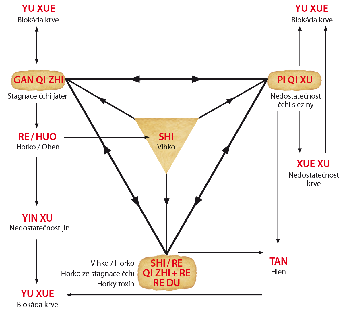 Většina dnešních chronických a zánětlivých nemocí se odvíjí od škodlivého vlhka SHI, které každý v sobě více či méně máme. TCM Triangl pak jsou  3 klasické vzorce, které se vyskytují současně a vzájemně se „podporují“, přičemž mají bohatou škálu příznaků. Zahrnuje v sobě  nedostatek čchi sleziny PI QI XUstagnaci jaterní čchi GAN QI ZHI a vždy  nějaký typ Horka RE – buď Vlhko/Horko SHI/RE nebo Horko vzniklé sekundárně ze stagnace energie čchi QI ZHI + RE. Kromě tohoto základního TCM Trianglu mohou nastat i další komplikace kupř. z nedostatku krve XUE XU a/nebo jinu YIN XU, blokády krve YU XUE a Hlenu TAN apod. Jak vidno, někdy může být celkový stav docela složitý, ale lze jej vždy rozpitvat a vysledovat zpětně až k těmto třem hlavním hráčům (viz obrázek). Avšak vlhko SHI dominuje u všech těchto syndromů a mělo by být středem zájmu každého terapeuta – je ve středu pomyslného rovnostranného trojúhelníku, nazývaného TCM Triangl. Proto je třeba začínat léčbu VŽDY od středu (tzv. od lesa).